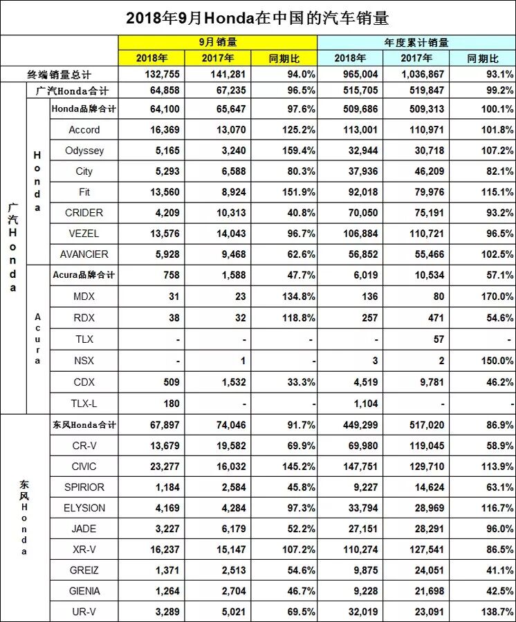 9月份,广汽本田终端销量数据为64,858辆,同比下滑了3.5%,而东风本田随着CR-V销量的回升以及思域的热销,跌幅有所回落,9月取得67,897辆,下跌了8.3%。