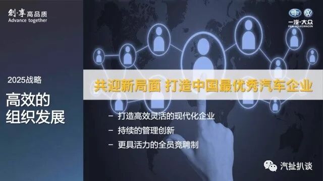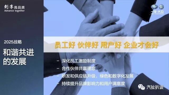 一汽-大众在2025战略中将打造“中国最优秀的汽车合资企业”的口号改为了打造“中国最优秀的汽车企业”。而这一夙愿也是一汽-大众对自己提出的更高要求。在汽车行业的新趋势要求下,一汽-大众就是要力求打造高效、灵活的现代化企业。并通过改革不断优化流程,提升决策效率及团队的活力和动力。