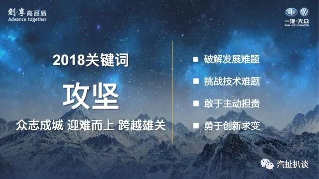 无论是一个国家、企业或是个人,谁都希望保持“今朝花开胜往昔,料得明日花更红”的发展势头。而经过了稳扎稳打的“专注”之年,并再度取得突破之后,一汽-大众在已经到来的2018年又会有哪些新的思考和目标呢?对此,一汽-大众汽车有限公司董事、总经理刘亦功在会上反复强调了一个词——“攻坚”。这又究竟所指为何呢?