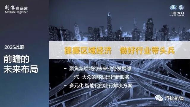 车联网、大数据、智能互联与自动驾驶已经成为了未来汽车工业的发展趋势,消费者对于这些智能科技的需求也在持续升温。为此,一汽-大众新成立了未来业务发展部,聚焦移动出行,加速业务转型,并提出了到2025年,全部产品实现车联网,智能出行做到全国前三的战略目标。