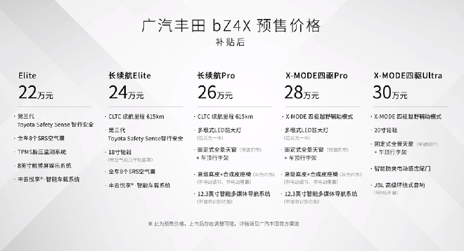 4月28日,广汽丰田首款e-TNGA纯电中型SUV bZ4X正式开启预售,根据配置不同共推出了5款车型,综合补贴后预售价为22-30万元。