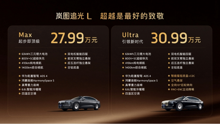 其27.99万元的起售价,结合超过5万元的用户权益,展现出“高配入场、诚意定价”的市场策略。这不仅将对同价位的传统豪华品牌燃油轿车形成压力,也可能动摇部分二线豪华品牌的市场根基。即便面对享界S9等国产新能源新贵,追光L在价格和技术方面,依然体现出较为明显优势。