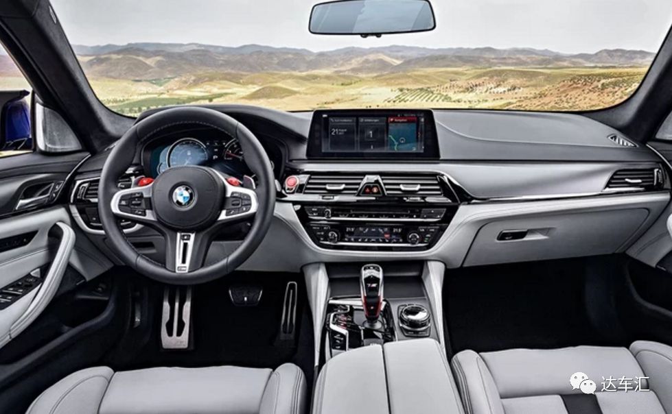 内饰方面,相比普通5系而言,主要是变得更加运动了。座椅的款式是典型的赛车风格,对于横向支撑从原来仅有的腰部似乎又增加了肩部横向支撑。整体座椅的款式造型设计感十足,M5 Logo醒目的烙印在头枕上。几个红色按键特别抢眼,再加上造型不一样的挡把,配上运动座椅,无不都在提醒你:“我和5系可不一样!”