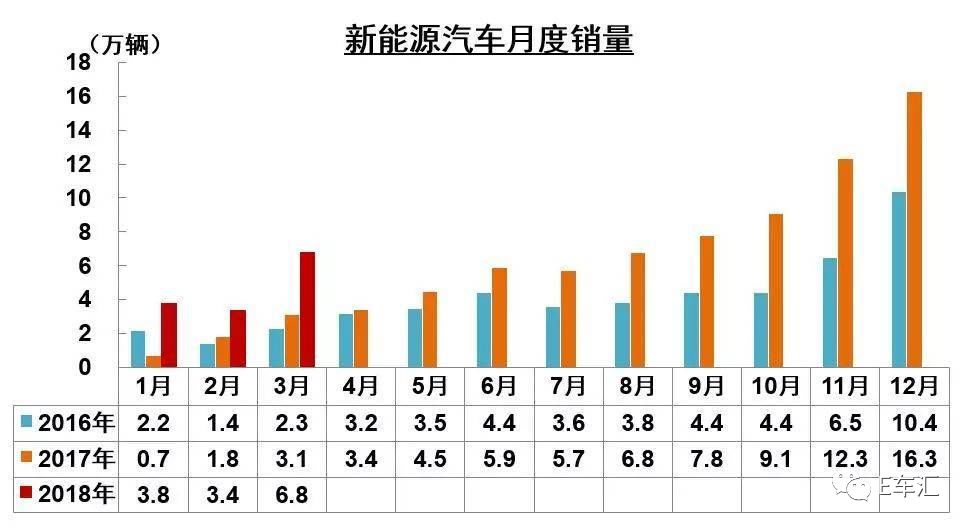 4月11日,中汽协发布了3月份汽车产销数据。2018年3月新能源汽车产销均为6.8万辆,其中纯电动汽车产销分别完成5.1万辆和5.2万辆;插电式混合动力汽车生产1.7万辆,销售1.6万辆,新能源汽车产销分别增长105%、117.4%。